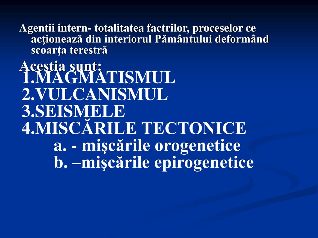 MAGMATISMUL • VULCANISMUL • SEISMELE • MISCĂRILE TECTONICE • a. - mişcările orogenetice • b. –mişcările epirogenetice Agentii intern- totalitatea factrilor, proceselor ce acţionează din interiorul Pământului deformând scoarţa terestră Aceştia sunt: