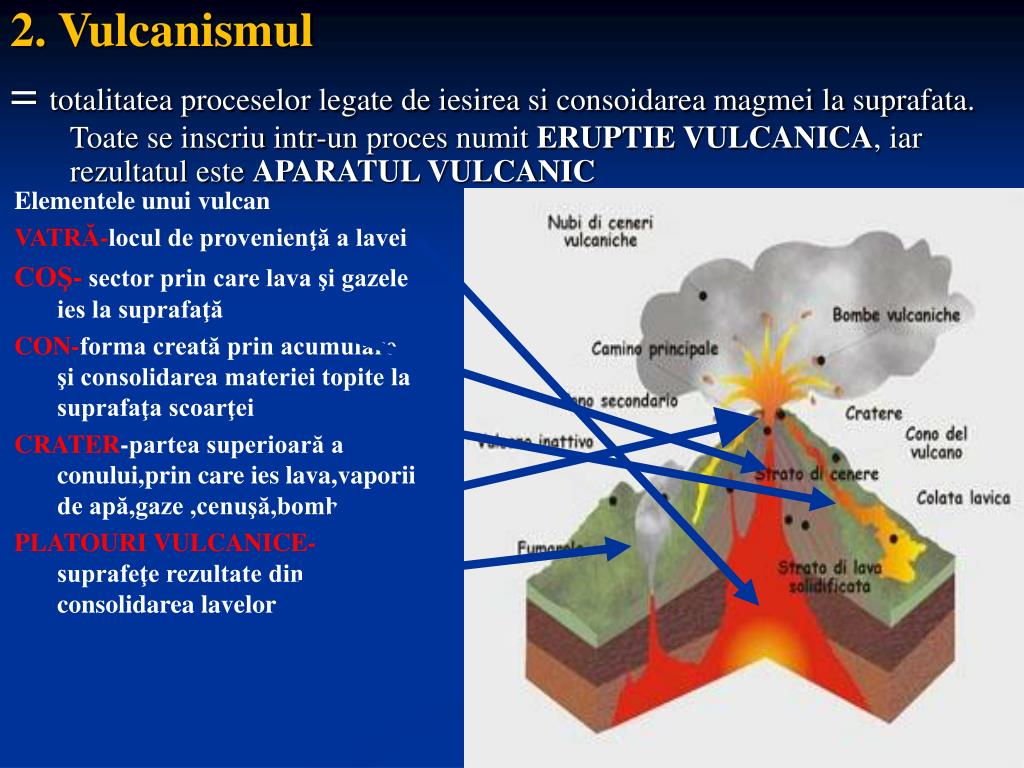 Elementeleunuivulcan • VATRĂ-locul de provenienţă a lavei • COŞ- sector prin care lava şi gazele ies la suprafaţă • CON-forma creată prin acumulare şi consolidarea materiei topite la suprafaţa scoarţei • CRATER-partea superioară a conului,prin care ies lava,vaporii de apă,gaze ,cenuşă,bombe • PLATOURI VULCANICE-suprafeţe rezultate din consolidarea lavelor 2. Vulcanismul = totalitatea proceselor legate de iesirea si consoidarea magmei la suprafata. Toate se inscriu intr-un proces numit ERUPTIE VULCANICA, iar rezultatul este APARATUL VULCANIC