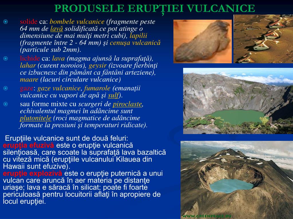 PRODUSELE ERUPŢIEI VULCANICE • solide ca: bombele vulcanice (fragmente peste 64 mm de lavă solidificată ce pot atinge o dimensiune de mai mulţi metri cubi), lapilii (fragmente între 2 - 64 mm) şi cenuşa vulcanică (particule sub 2mm). • lichide ca: lava (magma ajunsă la suprafaţă), lahar (curent noroios), geysir (izvoare fierbinţi ce izbucnesc din pământ ca fântâni arteziene), maare (lacuri circulare vulcanice) • gaze: gazevulcanice, fumarole (emanaţii vulcanice cu vapori de apă şi sulf). • sau forme mixte cu scurgeri de piroclaste, echivalentul magmei în adâncime sunt plutonitele (roci magmatice de adâncime formate la presiuni şi temperaturi ridicate). Erupţiile vulcanice sunt de două feluri: erupţia efuzivăeste o erupţie vulcanică silenţioasă, care scoate la suprafaţă lava bazaltică cu viteză mică (erupţiile vulcanului Kilauea din Hawaii sunt efuzive). erupţie explozivăeste o erupţie puternică a unui vulcan care aruncă în aer materia pe distanţe uriaşe; lava e săracă în silicat; poate fi foarte periculoasă pentru locuitorii aflaţi în apropiere de locul erupţiei.