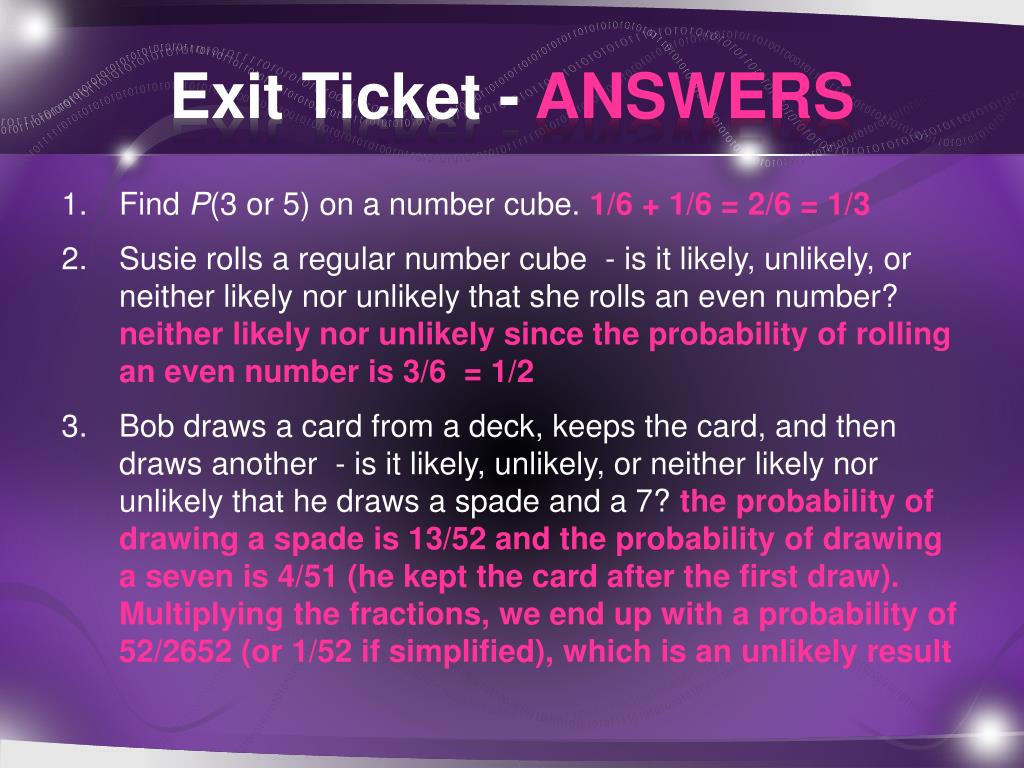 Exit Ticket - ANSWERS • Find P(3 or 5) on a number cube.1/6 + 1/6 = 2/6 = 1/3 • Susie rolls a regular number cube - is it likely, unlikely, or neither likely nor unlikely that she rolls an even number? neither likely nor unlikely since the probability of rolling an even number is 3/6 = 1/2 • Bob draws a card from a deck, keeps the card, and then draws another - is it likely, unlikely, or neither likely nor unlikely that he draws a spade and a 7? the probability of drawing a spade is 13/52 and the probability of drawing a seven is 4/51 (he kept the card after the first draw). Multiplying the fractions, we end up with a probability of 52/2652 (or 1/52 if simplified), which is an unlikely result