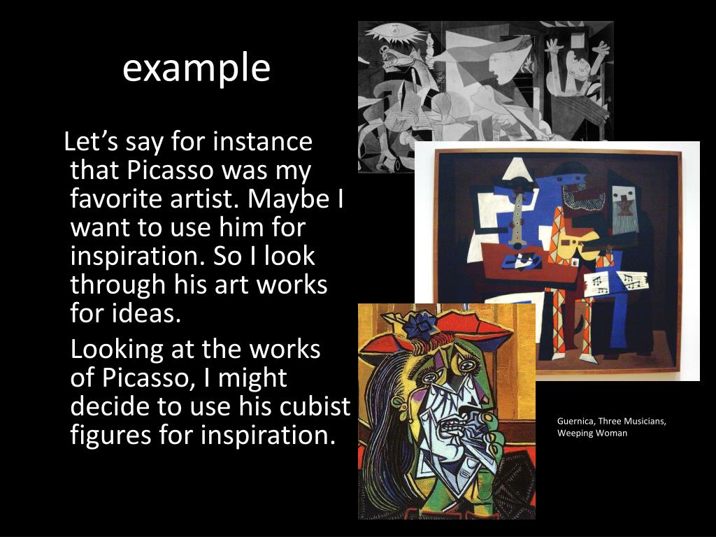 example Let’s say for instance that Picasso was my favorite artist. Maybe I want to use him for inspiration. So I look through his art works for ideas. Looking at the works of Picasso, I might decide to use his cubist figures for inspiration. Guernica, Three Musicians, Weeping Woman