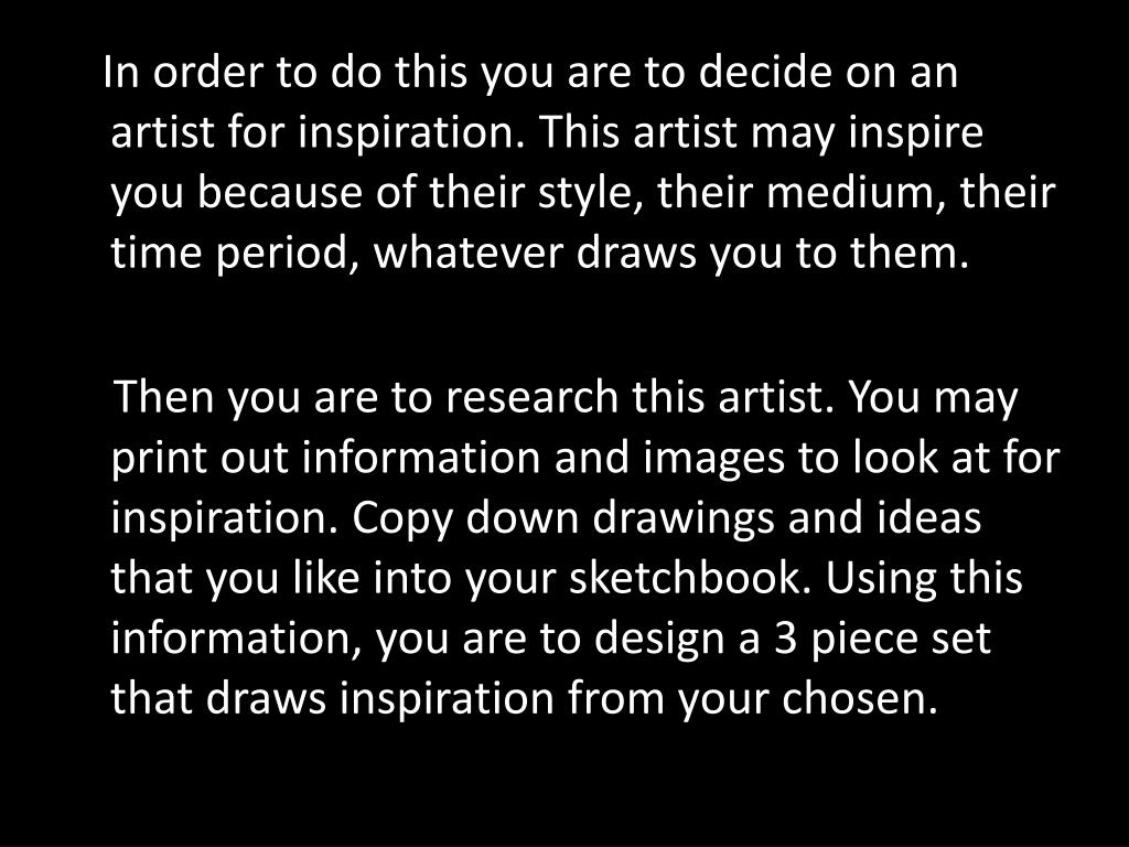 In order to do this you are to decide on an artist for inspiration. This artist may inspire you because of their style, their medium, their time period, whatever draws you to them. Then you are to research this artist. You may print out information and images to look at for inspiration. Copy down drawings and ideas that you like into your sketchbook. Using this information, you are to design a 3 piece set that draws inspiration from your chosen.