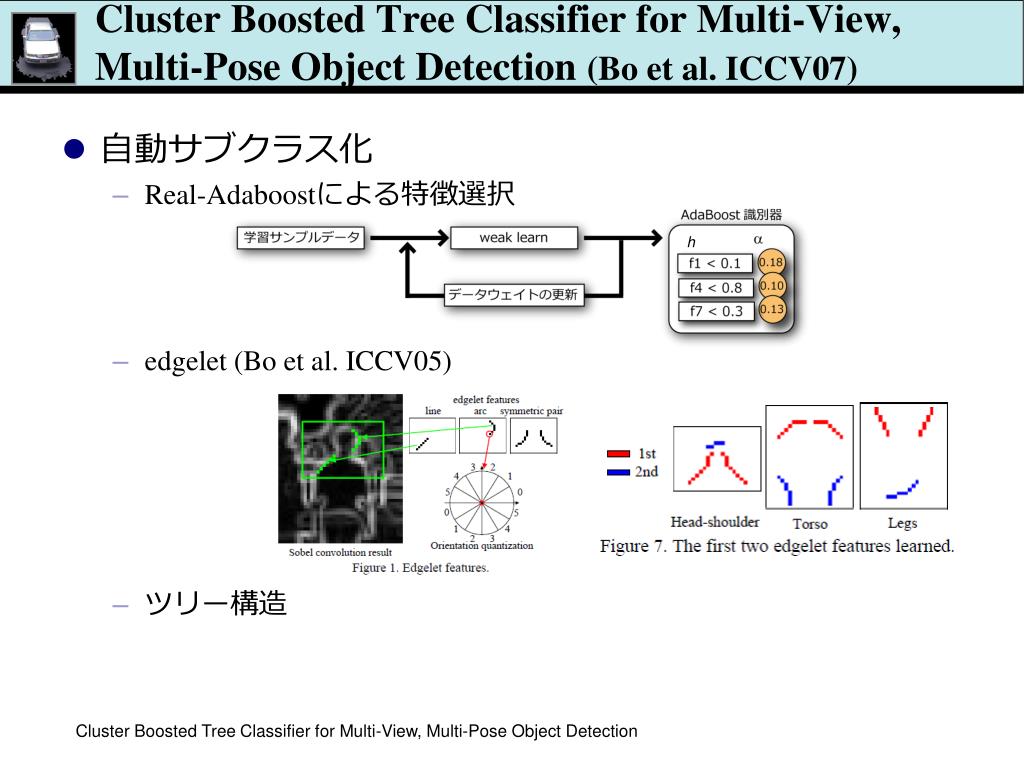 Cluster Boosted Tree Classifier for Multi-View, Multi-Pose Object Detection(Bo et al. ICCV07) • 自動サブクラス化 • Real-Adaboostによる特徴選択 • edgelet (Bo et al. ICCV05) • ツリー構造 h