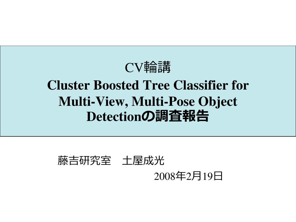 CV 輪講 Cluster Boosted Tree Classifier for Multi-View, Multi-Pose Object Detection の調査報告. 藤吉研究室 土屋成光 2008 年 2 月 19 日. 背景. 既知クラスの物体検出 CV における基本的な問題 物体のアピアランス 照明,視点, articulation によって大きく変化 多くのバリエーションのサブカテゴリによって構成された物体クラス 一括した判別は困難 分断攻略的な戦略が必要 Boosting に基づくサブクラスタリングを用いた 高精度な一般物体認識フレームワーク.