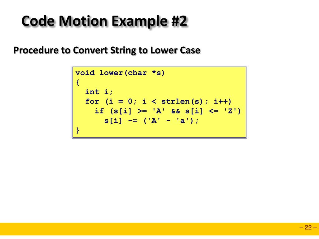 Code Motion Example #2 Procedure to Convert String to Lower Case void lower(char *s) { inti; for (i = 0; i < strlen(s); i++) if (s[i] >= 'A' && s[i] <= 'Z') s[i] -= ('A' - 'a'); }