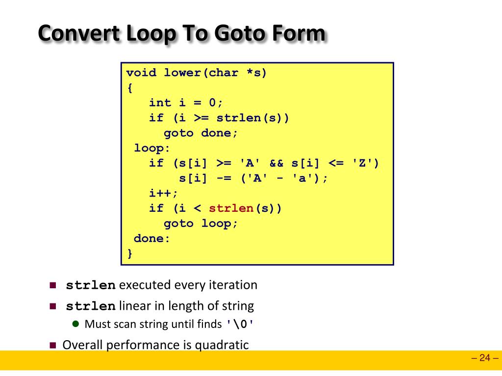 Convert Loop To Goto Form void lower(char *s) { int i = 0; if (i >= strlen(s)) goto done; loop: if (s[i] >= 'A' && s[i] <= 'Z') s[i] -= ('A' - 'a'); i++; if (i < strlen(s)) goto loop; done: } • strlenexecuted every iteration • strlen linear in length of string • Must scan string until finds '\0' • Overall performance is quadratic