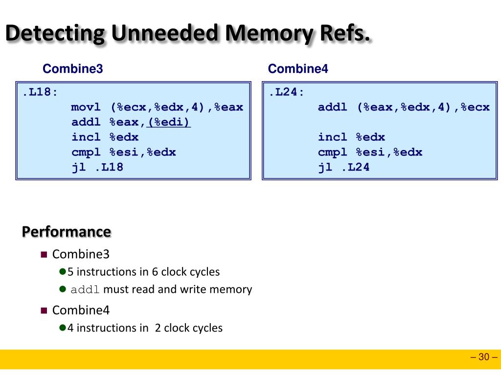 Detecting Unneeded Memory Refs. Combine3 Combine4 • Performance • Combine3 • 5 instructions in 6 clock cycles • addl must read and write memory • Combine4 • 4 instructions in 2 clock cycles .L18: movl (%ecx,%edx,4),%eax addl %eax,(%edi) incl %edx cmpl %esi,%edx jl .L18 .L24: addl (%eax,%edx,4),%ecx incl %edx cmpl %esi,%edx jl .L24