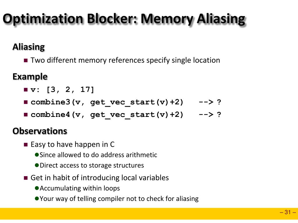 Optimization Blocker: Memory Aliasing • Aliasing • Two different memory references specify single location • Example • v: [3, 2, 17] • combine3(v, get_vec_start(v)+2) --> ? • combine4(v, get_vec_start(v)+2) --> ? • Observations • Easy to have happen in C • Since allowed to do address arithmetic • Direct access to storage structures • Get in habit of introducing local variables • Accumulating within loops • Your way of telling compiler not to check for aliasing