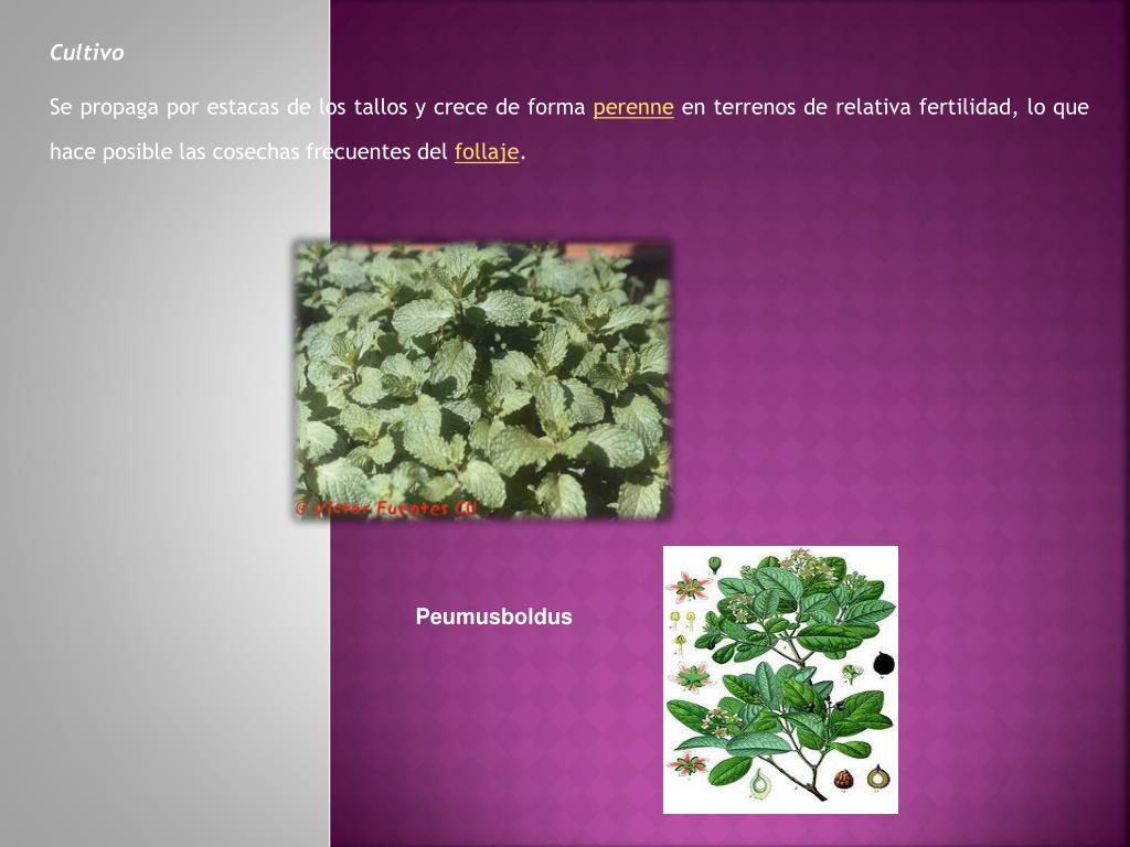Cultivo Se propaga por estacas de los tallos y crece de forma perenne en terrenos de relativa fertilidad, lo que hace posible las cosechas frecuentes del follaje. Peumusboldus