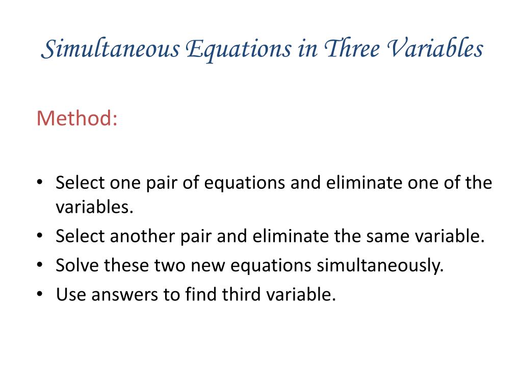 Simultaneous Equations in Three Variables Method: • Select one pair of equations and eliminate one of the variables. • Select another pair and eliminate the same variable. • Solve these two new equations simultaneously. • Use answers to find third variable.
