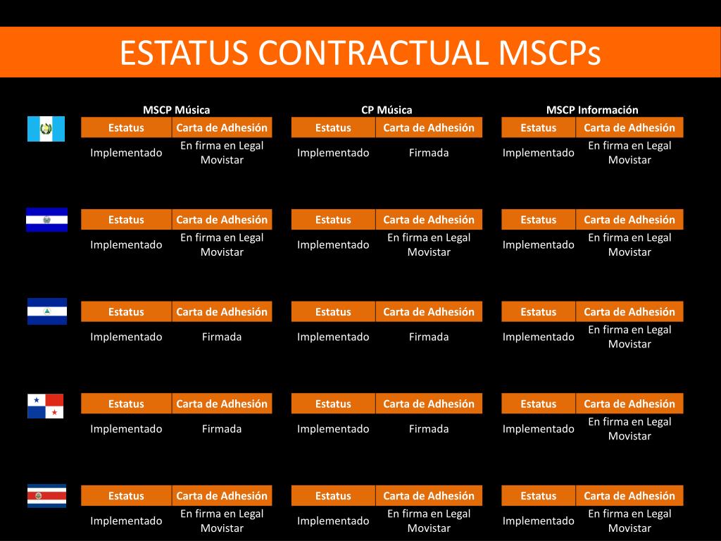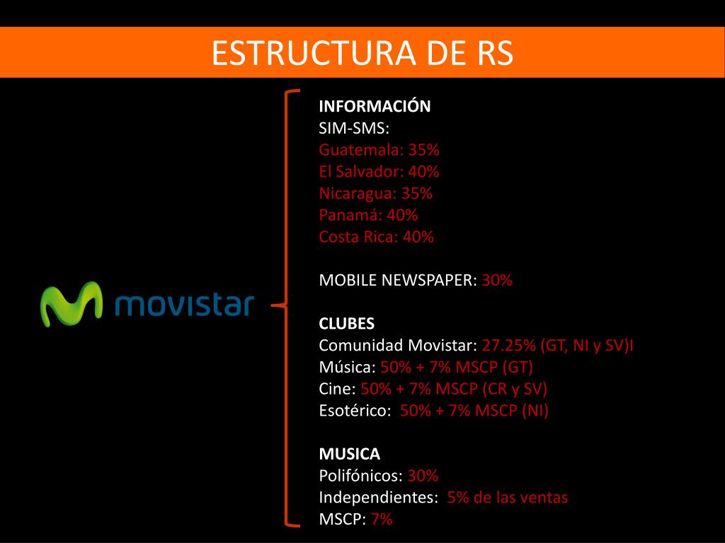 ESTRUCTURA DE RS • INFORMACIÓN • SIM-SMS: • Guatemala: 35% • El Salvador: 40% • Nicaragua: 35% • Panamá: 40% • Costa Rica: 40% • MOBILE NEWSPAPER: 30% • CLUBES • Comunidad Movistar: 27.25% (GT, NI y SV)I • Música: 50% + 7% MSCP (GT) • Cine: 50% + 7% MSCP (CR y SV) • Esotérico: 50% + 7% MSCP (NI) • MUSICA • Polifónicos: 30% • Independientes: 5% de las ventas • MSCP: 7%