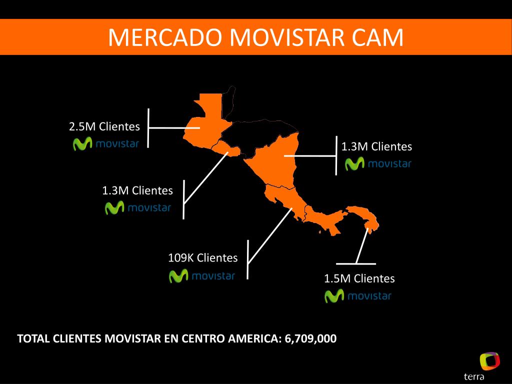 MERCADO MOVISTAR CAM 2.5M Clientes 1.3M Clientes 1.3M Clientes 109K Clientes 1.5M Clientes TOTAL CLIENTES MOVISTAR EN CENTRO AMERICA: 6,709,000