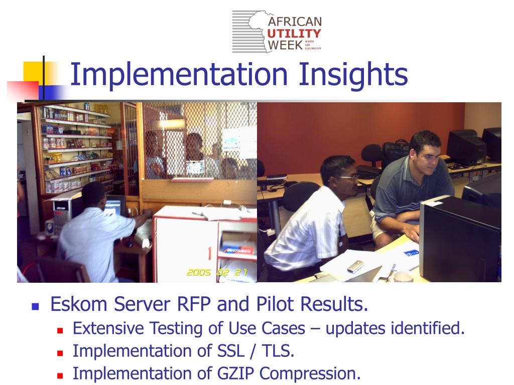 Implementation Insights • Eskom Server RFP and Pilot Results. • Extensive Testing of Use Cases – updates identified. • Implementation of SSL / TLS. • Implementation of GZIP Compression.