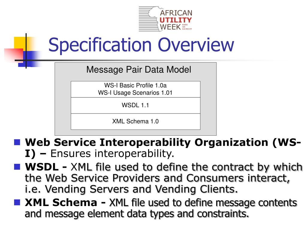 Specification Overview • Web Service Interoperability Organization (WS-I) – Ensures interoperability. • WSDL - XML file used to define the contract by which the Web Service Providers and Consumers interact, i.e. Vending Servers and Vending Clients. • XML Schema - XML file used to define message contents and message element data types and constraints.