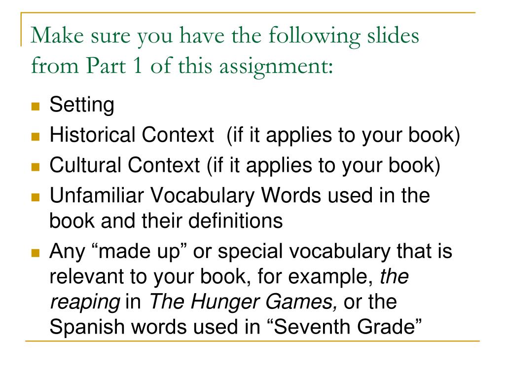 Make sure you have the following slides from Part 1 of this assignment: • Setting • Historical Context (if it applies to your book) • Cultural Context (if it applies to your book) • Unfamiliar Vocabulary Words used in the book and their definitions • Any “made up” or special vocabulary that is relevant to your book, for example, the reaping in The Hunger Games, or the Spanish words used in “Seventh Grade”