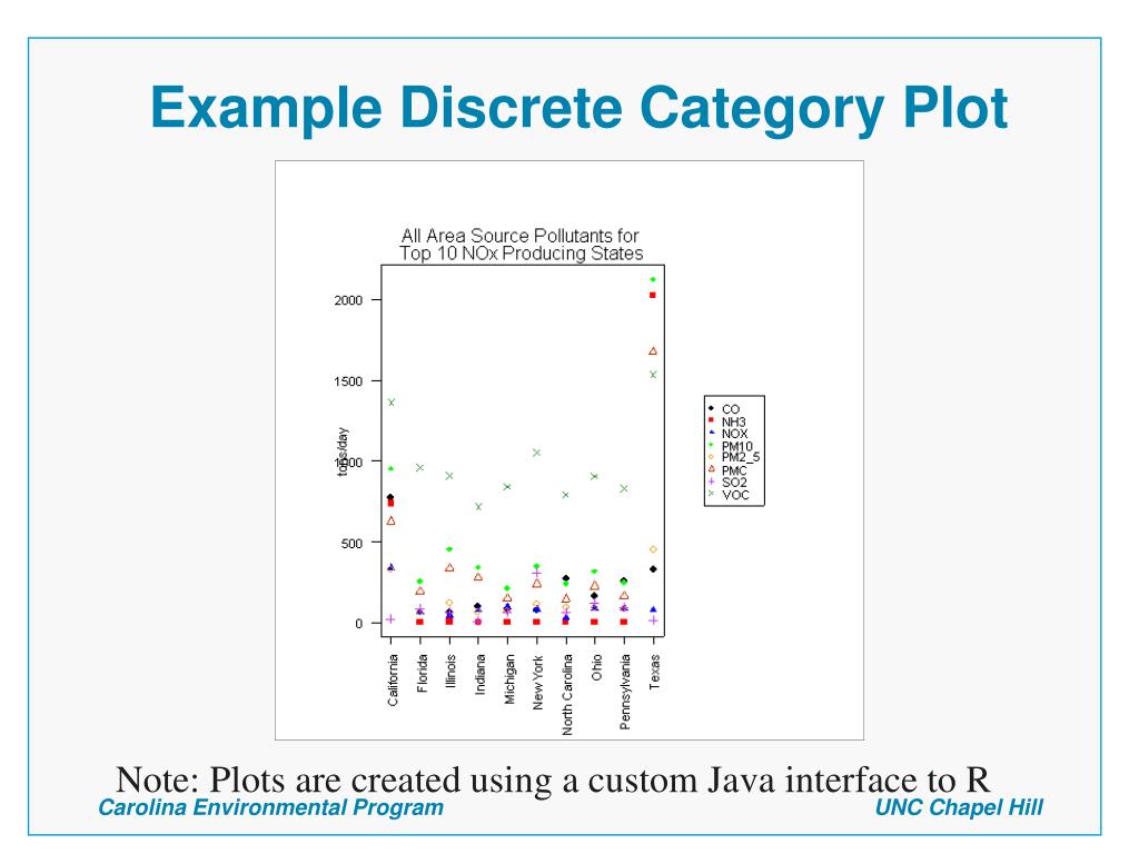 Example Discrete Category Plot Note: Plots are created using a custom Java interface to R Carolina Environmental Program UNC Chapel Hill