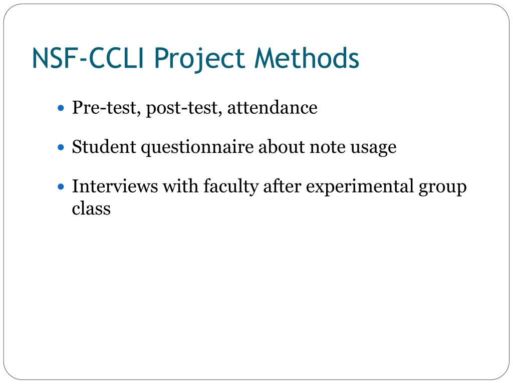 NSF-CCLI Project Methods • Pre-test, post-test, attendance • Student questionnaire about note usage • Interviews with faculty after experimental group class