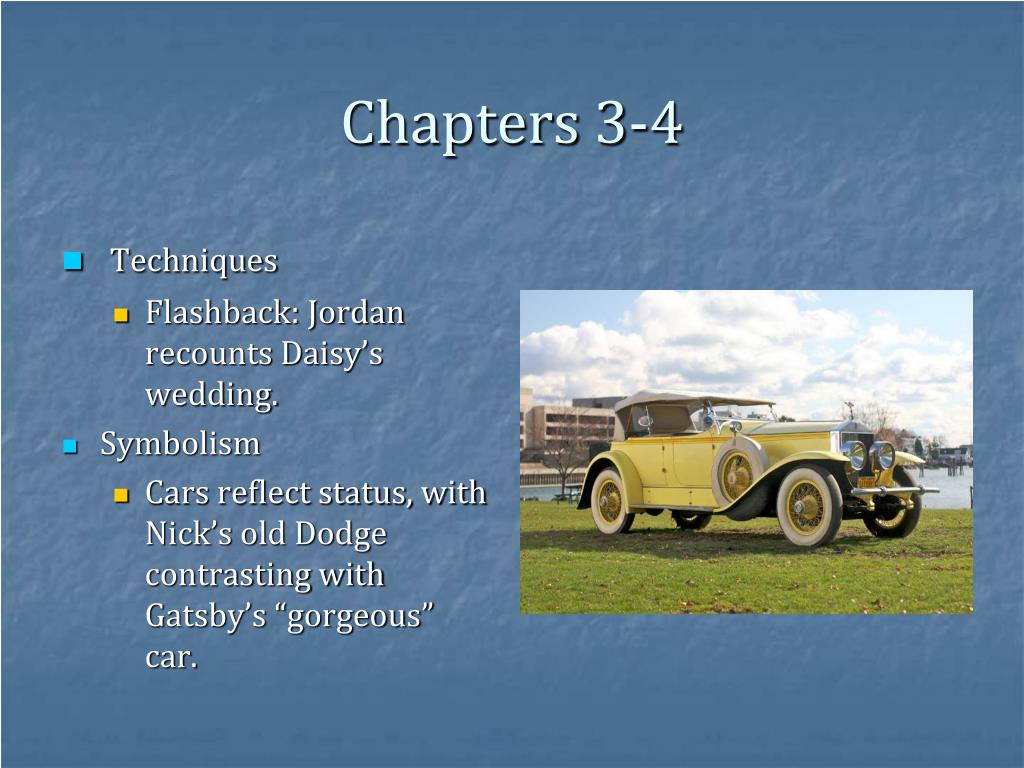 Chapters 3-4 • Techniques • Flashback: Jordan recounts Daisy’s wedding. • Symbolism • Cars reflect status, with Nick’s old Dodge contrasting with Gatsby’s “gorgeous” car.