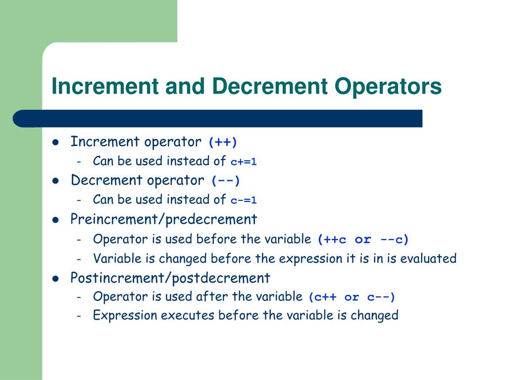 Increment Operator (++) #include <stdio.h> main() { int counter; /* number of grade to be entered next */ int total; /* sum of grades input by user */ int grade ; /* grade value */ int average; /* average of grades */ /* initialization phase */ counter = 1; total = 0; /* processing phase */ while ( counter <= 10 ) { /* loop 10 times */ printf( "Enter grade: " ); /* prompt for input */ scanf( "%d", &grade ); /* read grade from user */ total = total + grade; /* add grade to total */ counter = counter + 1; /* increment counter */ } /* end while */ /* termination phase */ average = total / 10; /* integer division */ printf("Class average is %d\n", average); /* display result */ } /* end function main */ int counter = 1; /* number of grade to be entered next */ int total = 0; /* sum of grades input by user */ total += grade; /* add grade to total */ counter += 1; /* increment counter */ counter++; /* increment counter */ Assignment statement