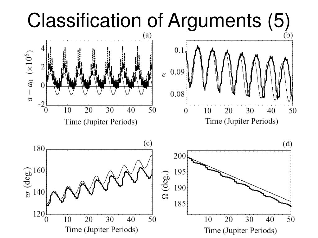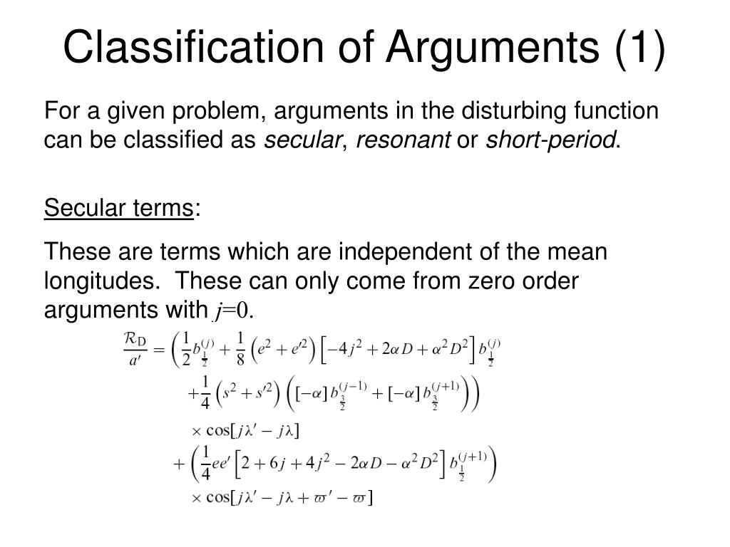 Classification of Arguments (1) For a given problem, arguments in the disturbing function can be classified as secular, resonant or short-period. Secular terms: These are terms which are independent of the mean longitudes. These can only come from zero order arguments with j=0.