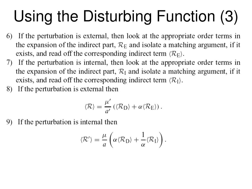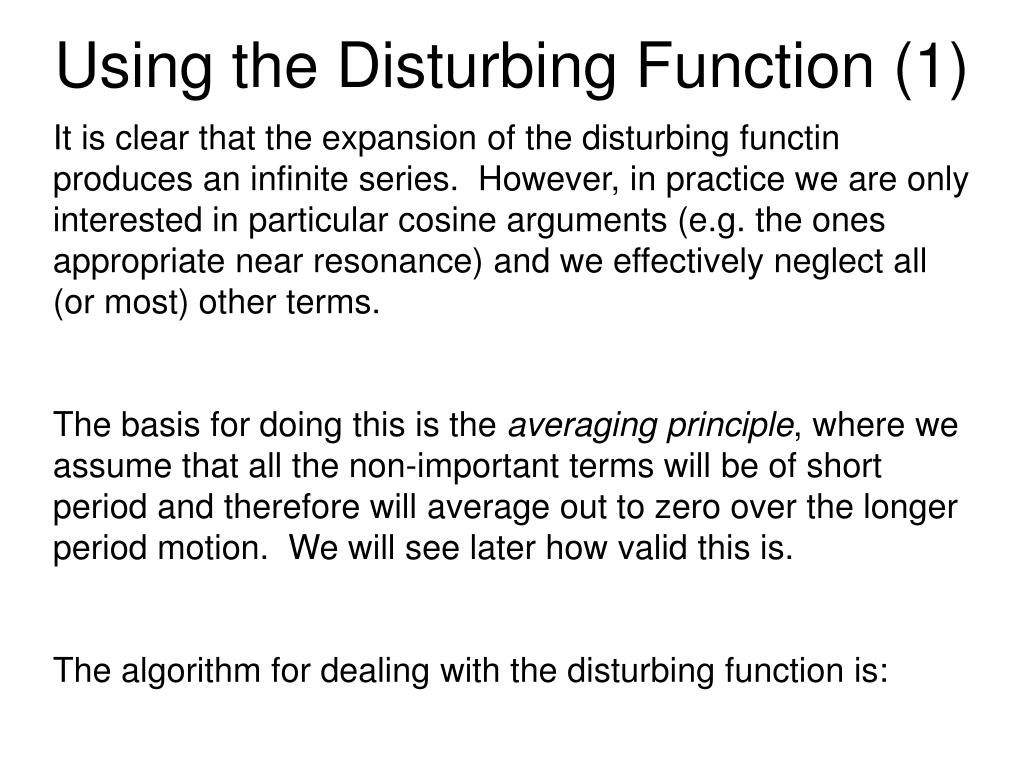 Using the Disturbing Function (1) It is clear that the expansion of the disturbing functin produces an infinite series. However, in practice we are only interested in particular cosine arguments (e.g. the ones appropriate near resonance) and we effectively neglect all (or most) other terms. The basis for doing this is the averaging principle, where we assume that all the non-important terms will be of short period and therefore will average out to zero over the longer period motion. We will see later how valid this is. The algorithm for dealing with the disturbing function is: