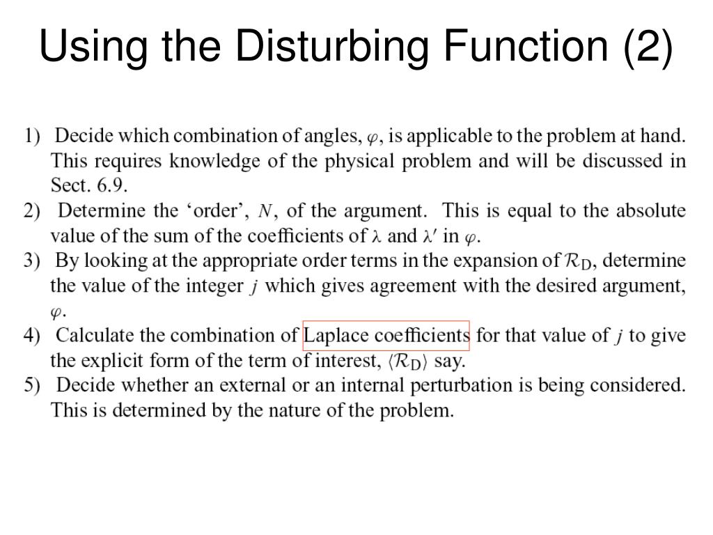 Introduction We have shown how the two-body problem can be solved. We have also looked at particular solutions of the three-body problem (equilibrium points, motion in their vicinity, etc.). But how do we deal with the more general problem of an object (in orbit about a central mass) being perturbed by an additional mass? The disturbing function is simply the gravitational potential that one body exerts on another expressed in terms of a series involving the orbital elements of both bodies. Knowledge of the disturbing function allows us to understand how planets perturb one another and is the basis of our study of secular and resonant motion.