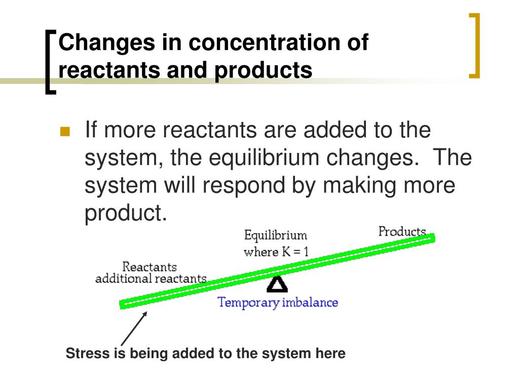 Changes in concentration of reactants and products • If more reactants are added to the system, the equilibrium changes. The system will respond by making more product. Stress is being added to the system here