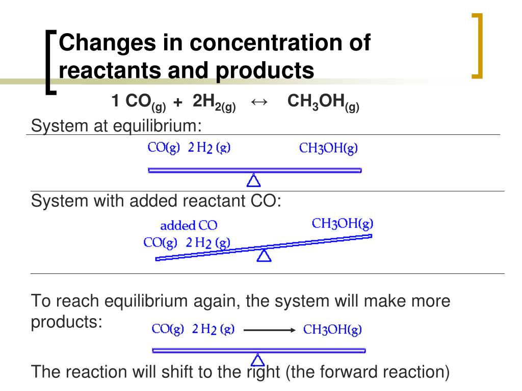 Changes in concentration of reactants and products 1 CO(g) + 2H2(g)↔ CH3OH(g) System at equilibrium: System with added reactant CO: To reach equilibrium again, the system will make more products: The reaction will shift to the right (the forward reaction)
