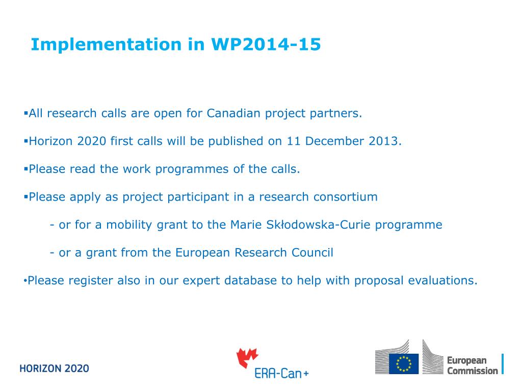 Implementation in WP2014-15 • All research calls are open for Canadian project partners. • Horizon 2020 first calls will be published on 11 December 2013. • Please read the work programmes of the calls. • Please apply as project participant in a research consortium • - or for a mobility grant to the Marie Skłodowska-Curie programme • - or a grant from the European Research Council • Please register also in our expert database to help with proposal evaluations.