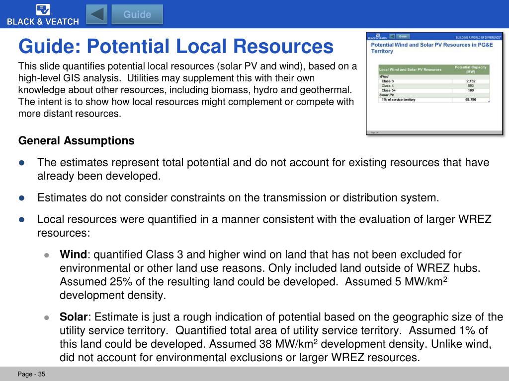 Guide Guide: Potential Local Resources • This slide quantifies potential local resources (solar PV and wind), based on a high-level GIS analysis. Utilities may supplement this with their own knowledge about other resources, including biomass, hydro and geothermal. The intent is to show how local resources might complement or compete with more distant resources. General Assumptions • The estimates represent total potential and do not account for existing resources that have already been developed. • Estimates do not consider constraints on the transmission or distribution system. • Local resources were quantified in a manner consistent with the evaluation of larger WREZ resources: • Wind: quantified Class 3 and higher wind on land that has not been excluded for environmental or other land use reasons. Only included land outside of WREZ hubs. Assumed 25% of the resulting land could be developed. Assumed 5 MW/km2 development density. • Solar: Estimate is just a rough indication of potential based on the geographic size of the utility service territory. Quantified total area of utility service territory. Assumed 1% of this land could be developed. Assumed 38 MW/km2 development density. Unlike wind, did not account for environmental exclusions or larger WREZ resources. Page - 35
