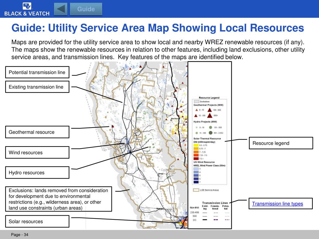Guide Guide: Utility Service Area Map Showing Local Resources Maps are provided for the utility service area to show local and nearby WREZ renewable resources (if any). The maps show the renewable resources in relation to other features, including land exclusions, other utility service areas, and transmission lines. Key features of the maps are identified below. Potential transmission line Existing transmission line Geothermal resource Resource legend Wind resources Hydro resources Exclusions: lands removed from consideration for development due to environmental restrictions (e.g., wilderness area), or other land use constraints (urban areas) Transmission line types Solar resources Page - 34