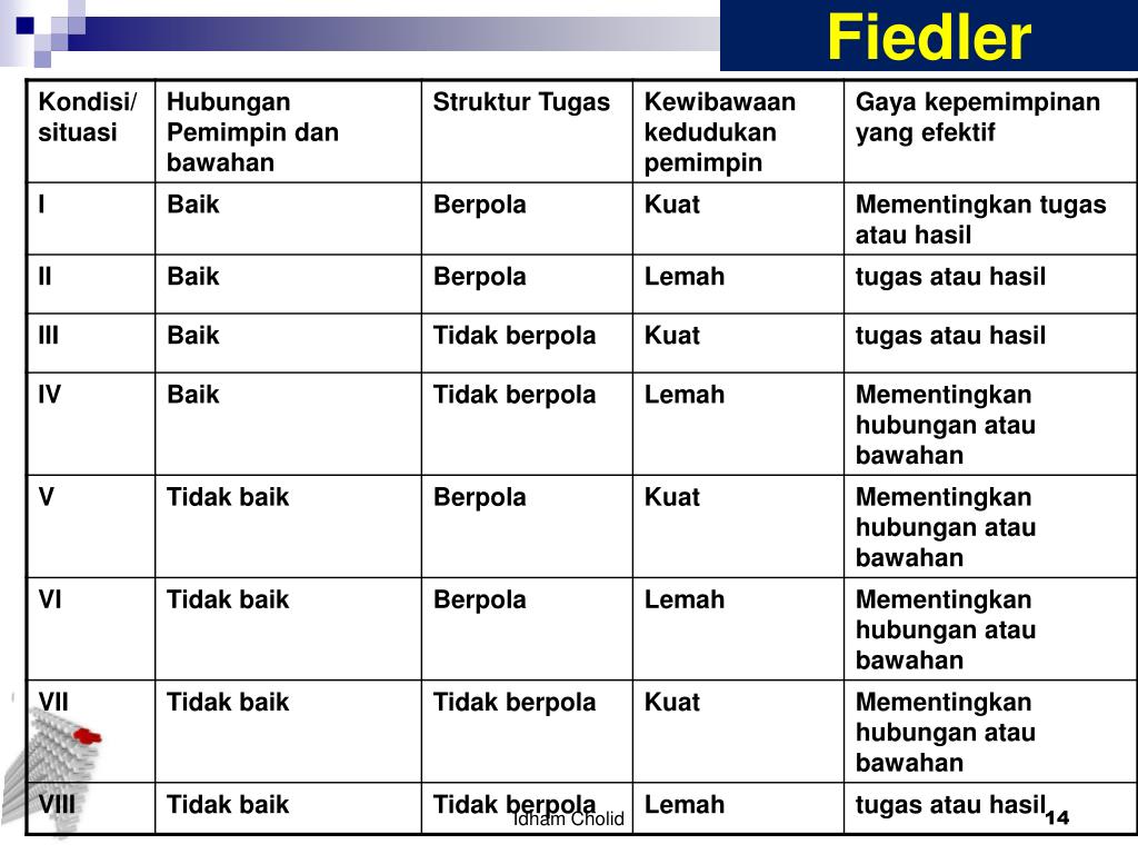 Fiedler Elemen Penting Ada 3 macam elemen penting yang akan menentukan perilaku/gaya pemimpin yang efektif : hubungan antara pemimpin dan bawahan struktur tugas kewibawaan kedudukan pemimpin Idham Cholid
