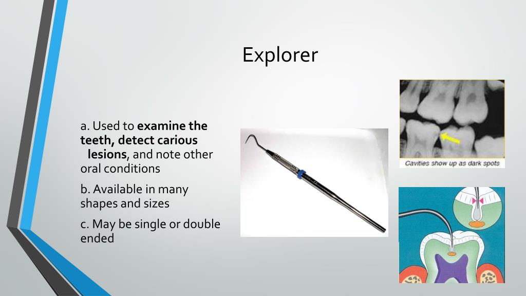 Explorer a. Used to examine the teeth, detect carious lesions, and note other oral conditions b. Available in many shapes and sizes c. May be single or double ended