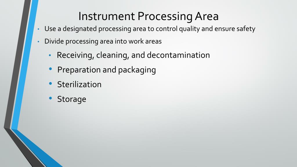 Instrument Processing Area • Use a designated processing area to control quality and ensure safety • Divide processing area into work areas • Receiving, cleaning, and decontamination • Preparation and packaging • Sterilization • Storage