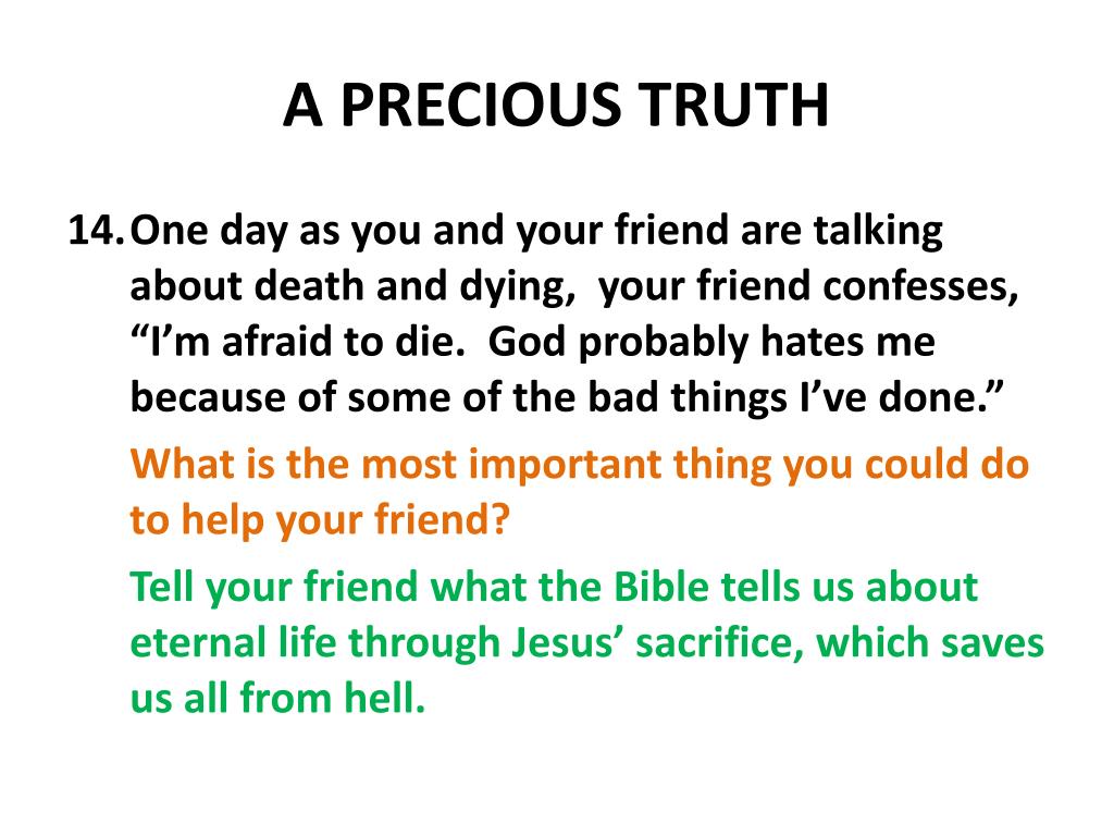A PRECIOUS TRUTH • One day as you and your friend are talking about death and dying, your friend confesses, “I’m afraid to die. God probably hates me because of some of the bad things I’ve done.” What is the most important thing you could do to help your friend? Tell your friend what the Bible tells us about eternal life through Jesus’ sacrifice, which saves us all from hell.