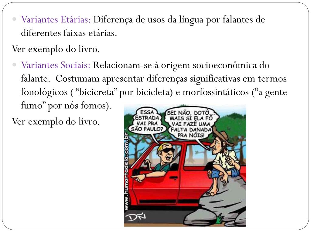Variantes Etárias: Diferença de usos da língua por falantes de diferentes faixas etárias. Ver exemplo do livro. • Variantes Sociais: Relacionam-se à origem socioeconômica do falante. Costumam apresentar diferenças significativas em termos fonológicos ( “bicicreta” por bicicleta) e morfossintáticos (“a gente fumo” por nós fomos). Ver exemplo do livro.