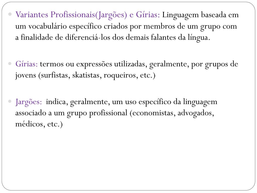 Variantes Profissionais(Jargões) e Gírias: Linguagem baseada em um vocabulário específico criados por membros de um grupo com a finalidade de diferenciá-los dos demais falantes da língua. • Gírias: termos ou expressões utilizadas, geralmente, por grupos de jovens (surfistas, skatistas, roqueiros, etc.) • Jargões: indica, geralmente, um uso específico da linguagem associado a um grupo profissional (economistas, advogados, médicos, etc.)