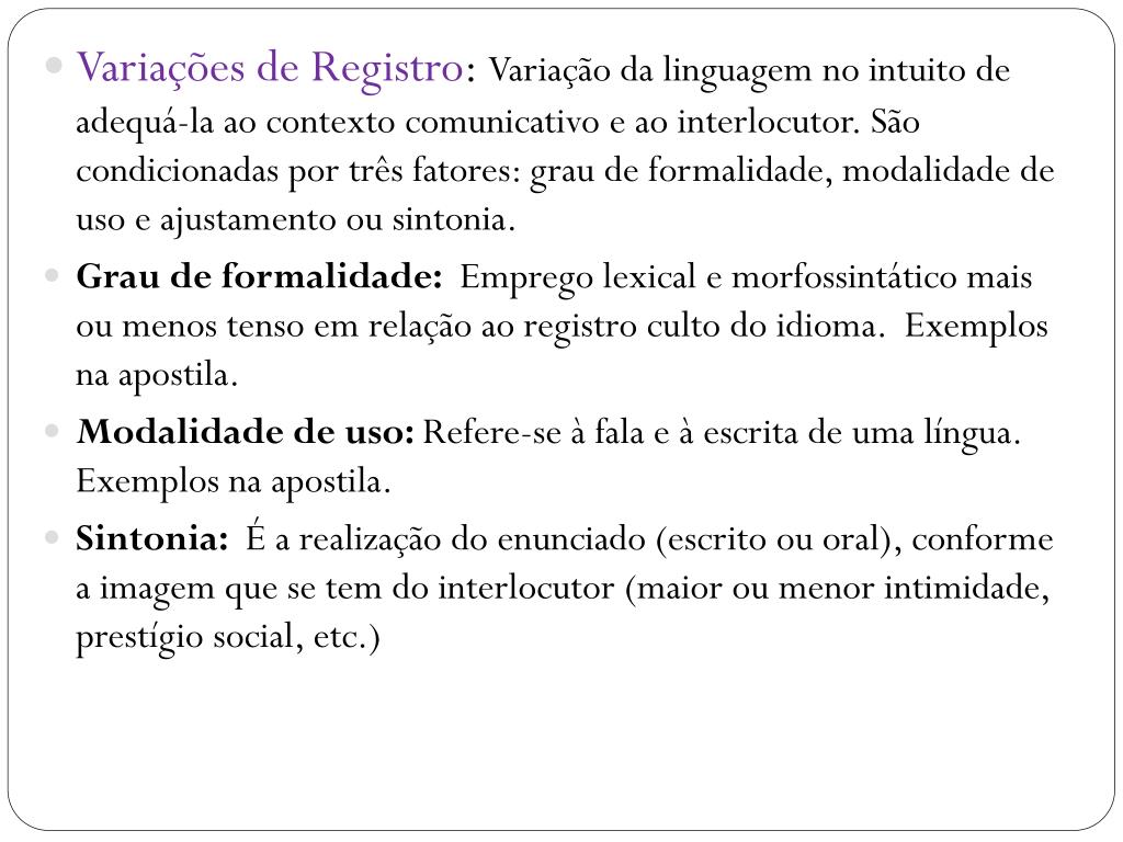 Variações de Registro: Variação da linguagem no intuito de adequá-la ao contexto comunicativo e ao interlocutor. São condicionadas por três fatores: grau de formalidade, modalidade de uso e ajustamento ou sintonia. • Grau de formalidade: Emprego lexical e morfossintático mais ou menos tenso em relação ao registro culto do idioma. Exemplos na apostila. • Modalidade de uso: Refere-se à fala e à escrita de uma língua. Exemplos na apostila. • Sintonia: É a realização do enunciado (escrito ou oral), conforme a imagem que se tem do interlocutor (maior ou menor intimidade, prestígio social, etc.)