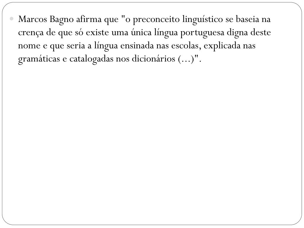Marcos Bagnoafirma que "o preconceito linguísticose baseia na crença de que só existe uma única língua portuguesa digna deste nome e que seria a língua ensinada nas escolas, explicada nas gramáticas e catalogadas nos dicionários (...)".