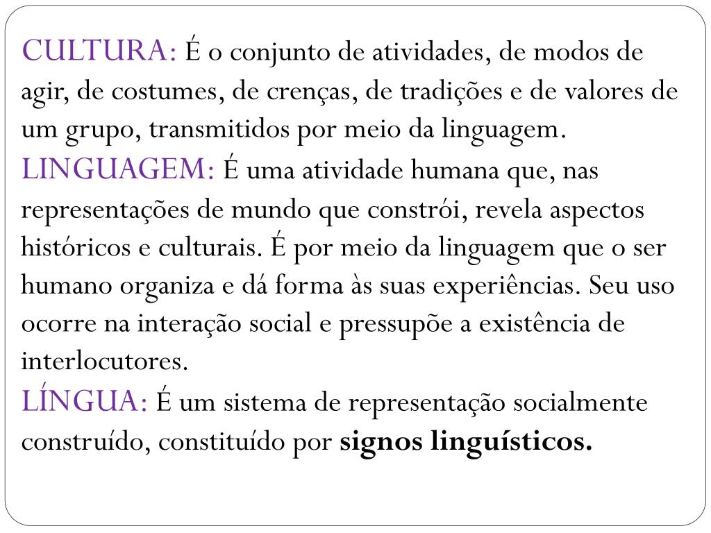 CULTURA:É o conjunto de atividades, de modos de agir, de costumes, de crenças, de tradições e de valores de um grupo, transmitidos por meio da linguagem. LINGUAGEM: É uma atividade humana que, nas representações de mundo que constrói, revela aspectos históricos e culturais. É por meio da linguagem que o ser humano organiza e dá forma às suas experiências. Seu uso ocorre na interação social e pressupõe a existência de interlocutores. LÍNGUA: É um sistema de representação socialmente construído, constituído por signos linguísticos.