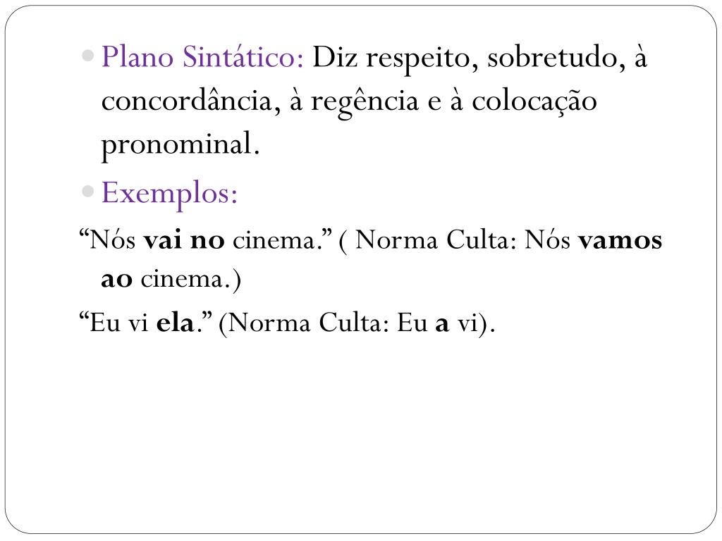 Plano Sintático: Diz respeito, sobretudo, à concordância, à regência e à colocação pronominal. • Exemplos: “Nós vai no cinema.” ( Norma Culta: Nós vamos ao cinema.) “Eu vi ela.” (Norma Culta: Eu a vi).