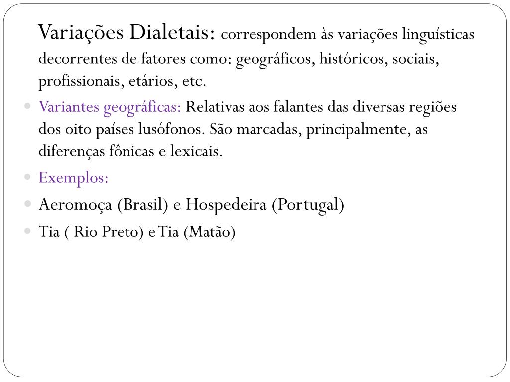 Variações Dialetais: correspondem às variações linguísticas decorrentes de fatores como: geográficos, históricos, sociais, profissionais, etários, etc. • Variantes geográficas: Relativas aos falantes das diversas regiões dos oito países lusófonos. São marcadas, principalmente, as diferenças fônicas e lexicais. • Exemplos: • Aeromoça (Brasil) e Hospedeira (Portugal) • Tia ( Rio Preto) e Tia (Matão)
