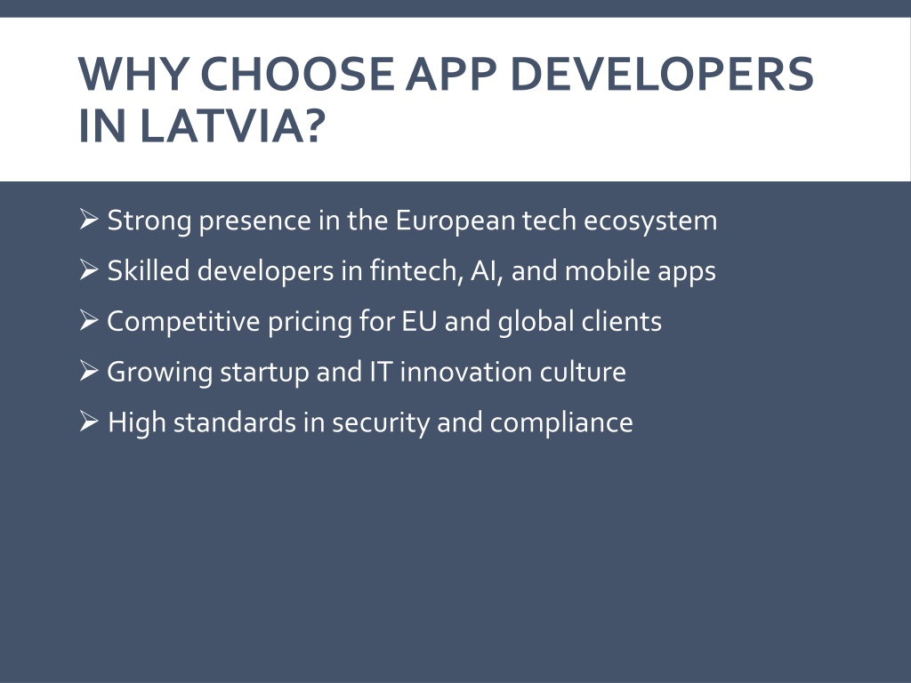WHY CHOOSE APP DEVELOPERS IN LATVIA? ➢Strong presence in the European tech ecosystem ➢Skilled developers in fintech, AI, and mobile apps ➢Competitive pricing for EU and global clients ➢Growing startup and IT innovation culture ➢ High standards in security and compliance