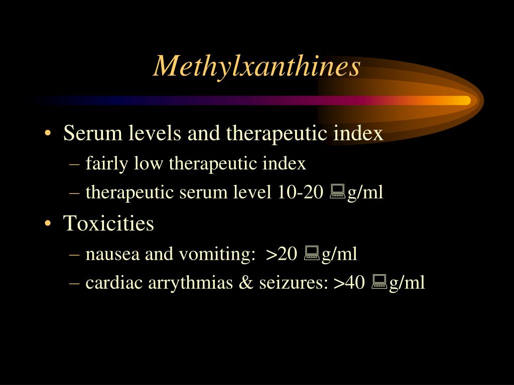 Methylxanthines • Serum levels and therapeutic index • fairly low therapeutic index • therapeutic serum level 10-20 g/ml • Toxicities • nausea and vomiting: >20 g/ml • cardiac arrythmias & seizures: >40 g/ml