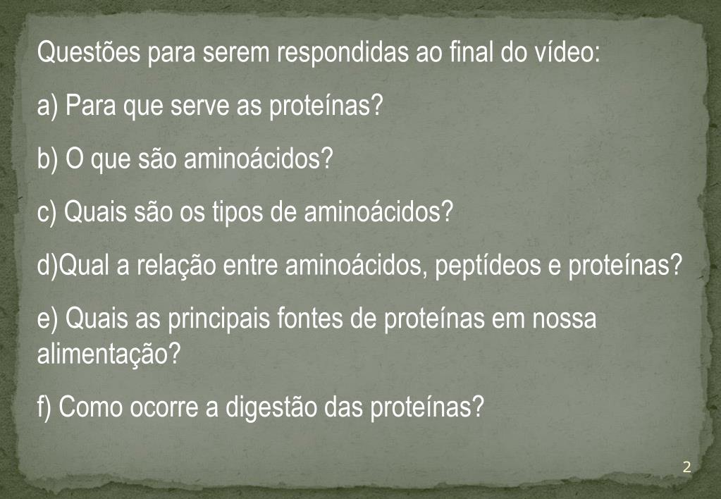 Questões para serem respondidas ao final do vídeo: a) Para que serve as proteínas? b) O que são aminoácidos? c) Quais são os tipos de aminoácidos? d)Qual a relação entre aminoácidos, peptídeos e proteínas? e) Quais as principais fontes de proteínas em nossa alimentação? f) Como ocorre a digestão das proteínas?