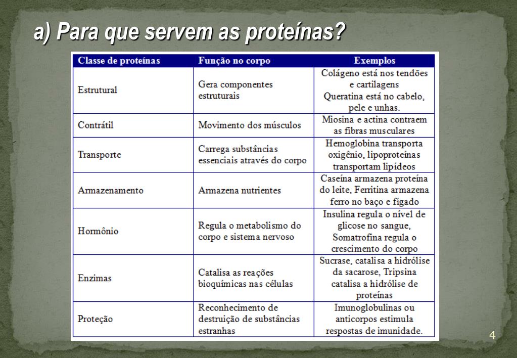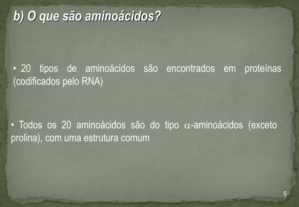 b) O que são aminoácidos? • 20 tipos de aminoácidos são encontrados em proteínas (codificados pelo RNA) • Todos os 20 aminoácidos são do tipo -aminoácidos (exceto prolina), com uma estrutura comum