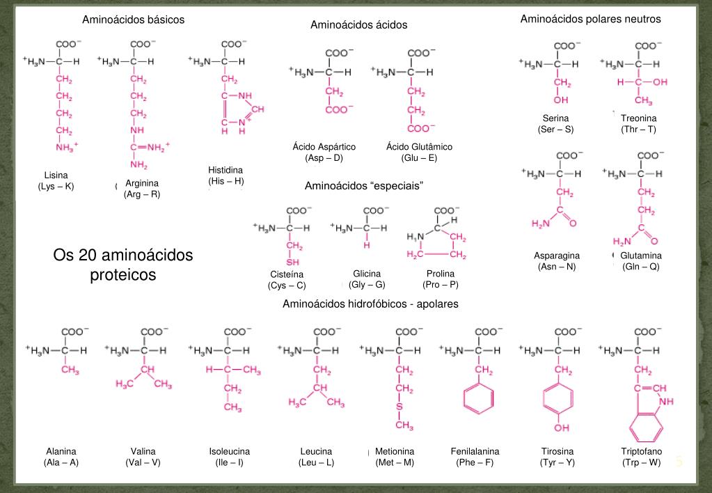 Aminoácidos polares neutros Aminoácidos ácidos Serina (Ser – S) Treonina (Thr – T) Ácido Aspártico (Asp – D) Ácido Glutâmico (Glu – E) Aminoácidos “especiais” Asparagina (Asn – N) Glutamina (Gln – Q) Glicina (Gly – G) Prolina (Pro – P) Cisteína (Cys – C) Aminoácidos básicos Histidina (His – H) Lisina (Lys – K) Arginina (Arg – R) Os 20 aminoácidos proteicos Aminoácidos hidrofóbicos - apolares Alanina (Ala – A) Valina (Val – V) Isoleucina (Ile – I) Leucina (Leu – L) Metionina (Met – M) Fenilalanina (Phe – F) Tirosina (Tyr – Y) Triptofano (Trp – W)
