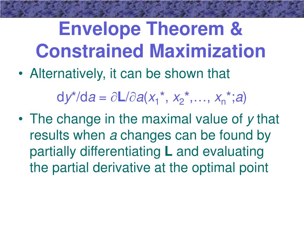 Envelope Theorem & Constrained Maximization • Alternatively, it can be shown that dy*/da = L/a(x1*, x2*,…, xn*;a) • The change in the maximal value of y that results when a changes can be found by partially differentiating L and evaluating the partial derivative at the optimal point