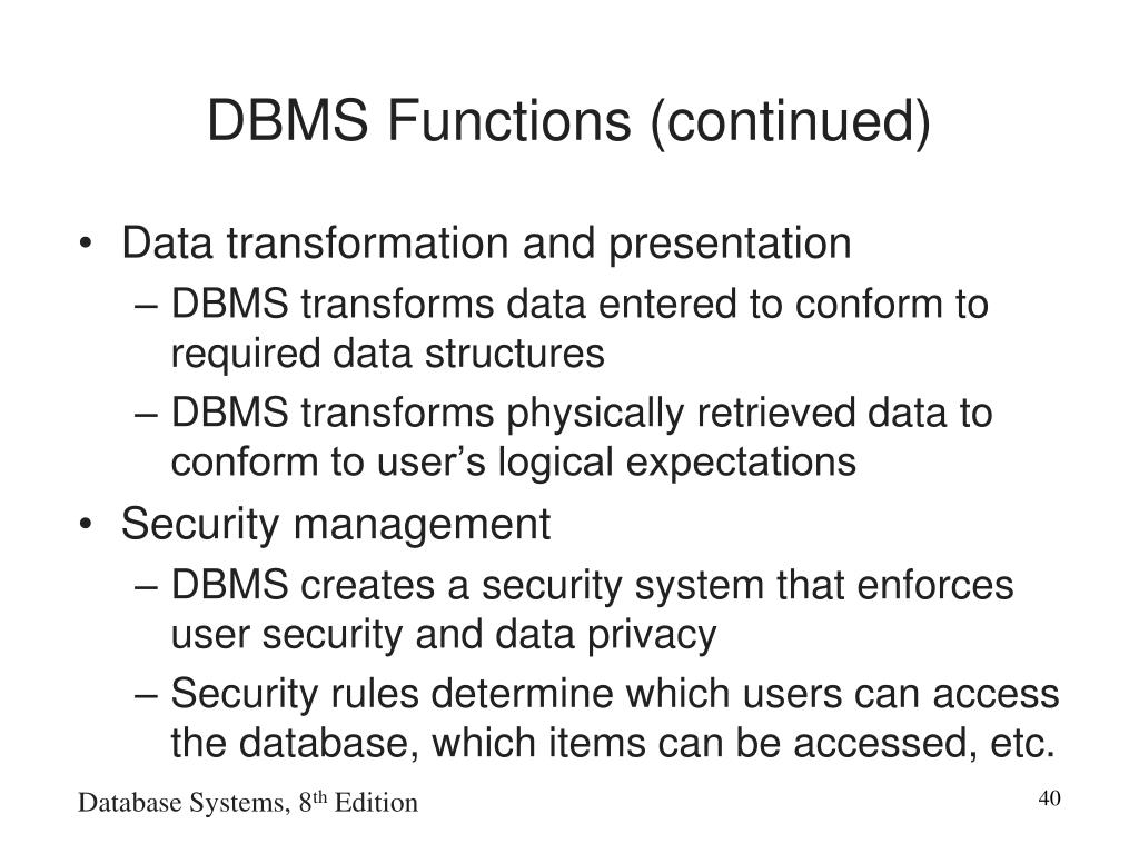 DBMS Functions (continued) • Data transformation and presentation • DBMS transforms data entered to conform to required data structures • DBMS transforms physically retrieved data to conform to user’s logical expectations • Security management • DBMS creates a security system that enforces user security and data privacy • Security rules determine which users can access the database, which items can be accessed, etc. Database Systems, 8th Edition
