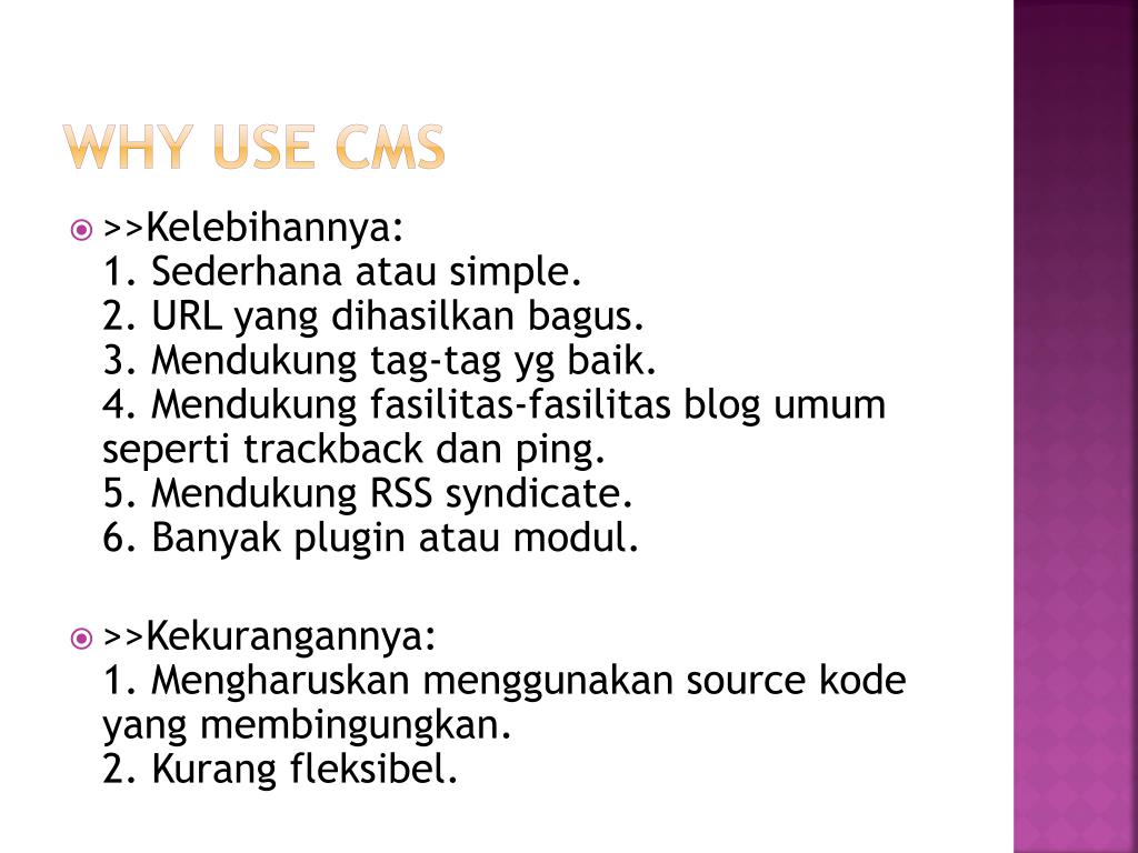 Why Use CMS • >>Kelebihannya:1. Sederhanaatau simple.2. URL yang dihasilkanbagus.3. Mendukung tag-tag ygbaik.4. Mendukungfasilitas-fasilitas blog umumseperti trackback dan ping.5. Mendukung RSS syndicate.6. Banyakpluginataumodul. • >>Kekurangannya:1. Mengharuskanmenggunakan source kode yang membingungkan.2. Kurangfleksibel.